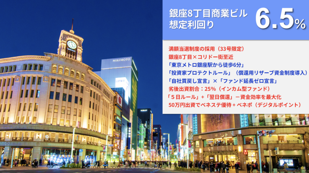 投資額に応じて「ベネポ」や次回ファンドの当選確率アップがもらえる。