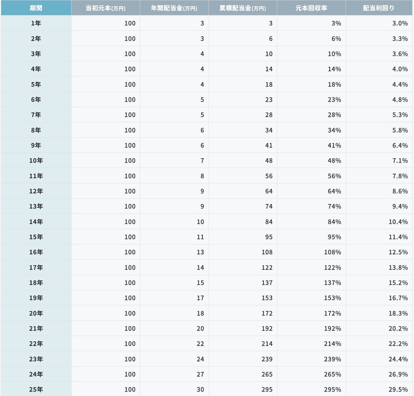 1年目には3万円だった年間の配当金が、